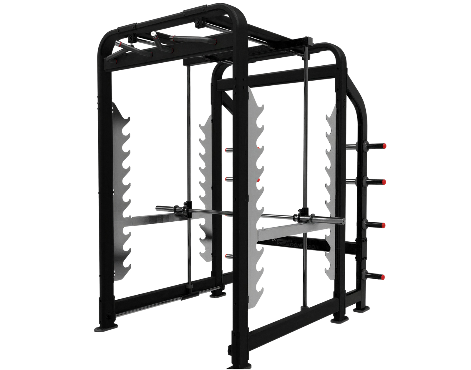 Hybrid Safety Design with Racking Options: Combines the safety of a Smith Machine and the versatility of a Power Rack, with multiple bar rack safety catches for forward, rear, and lower racking positions.